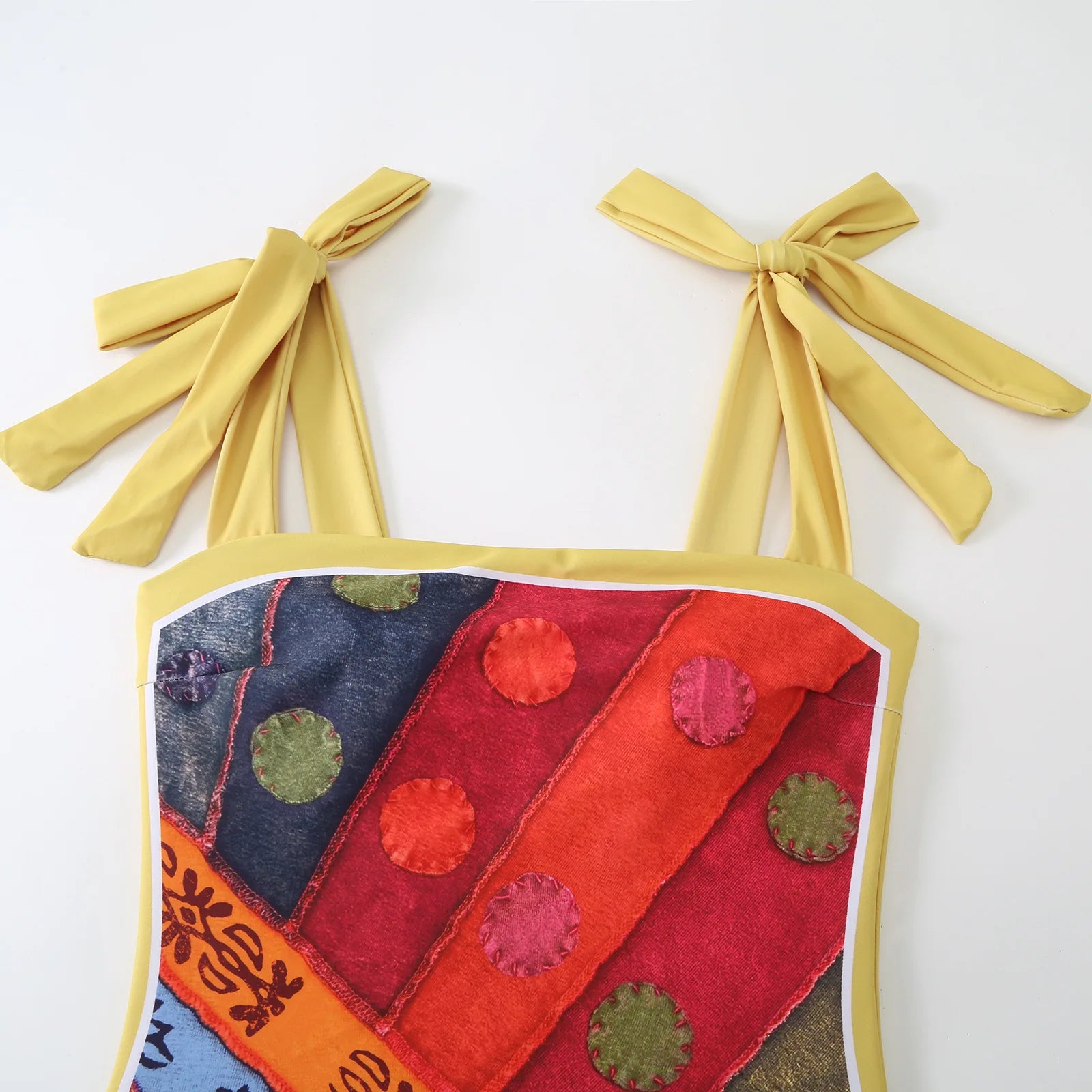 Colorful Patchwork Swimsuit Set with Bow-Tie Straps & Matching Sarong